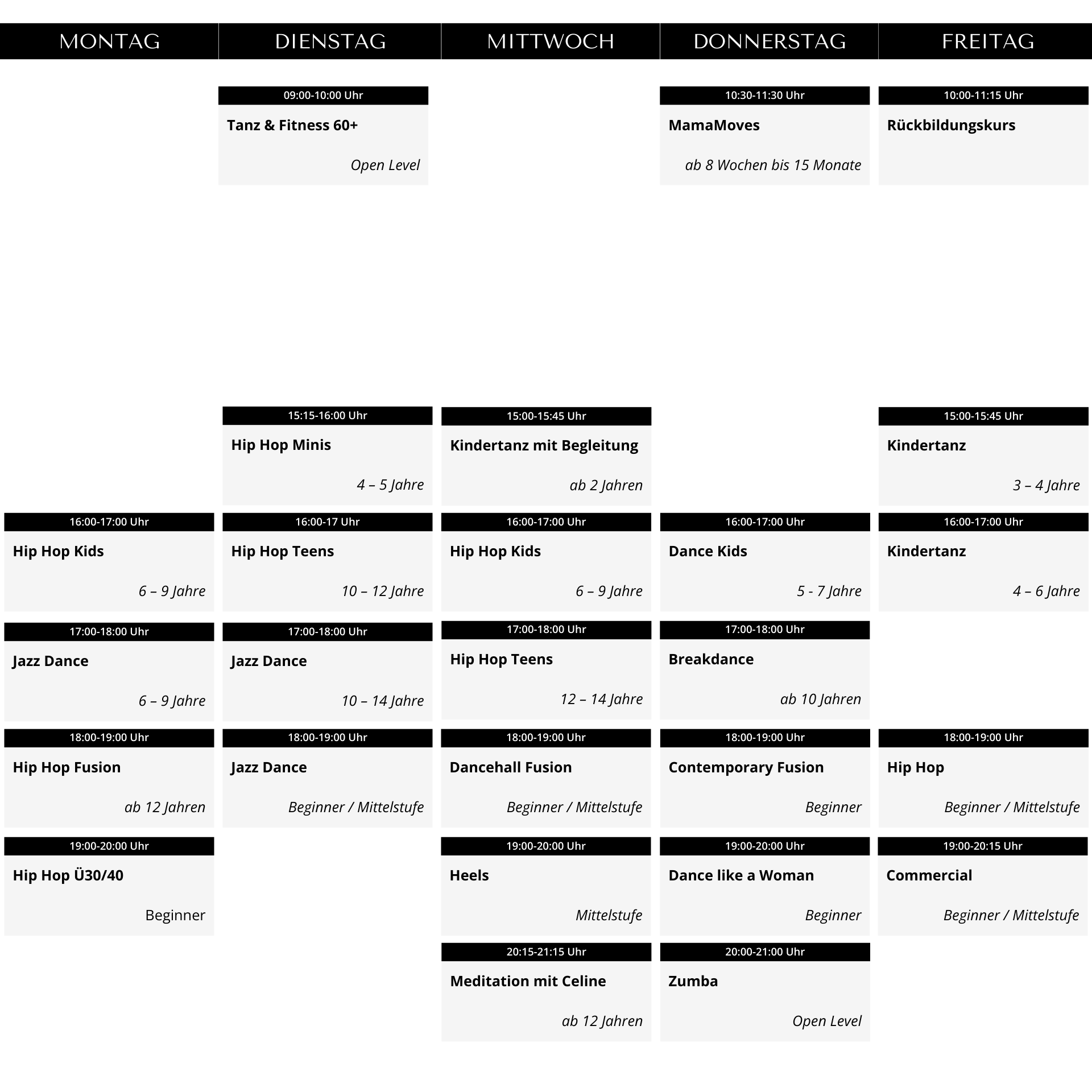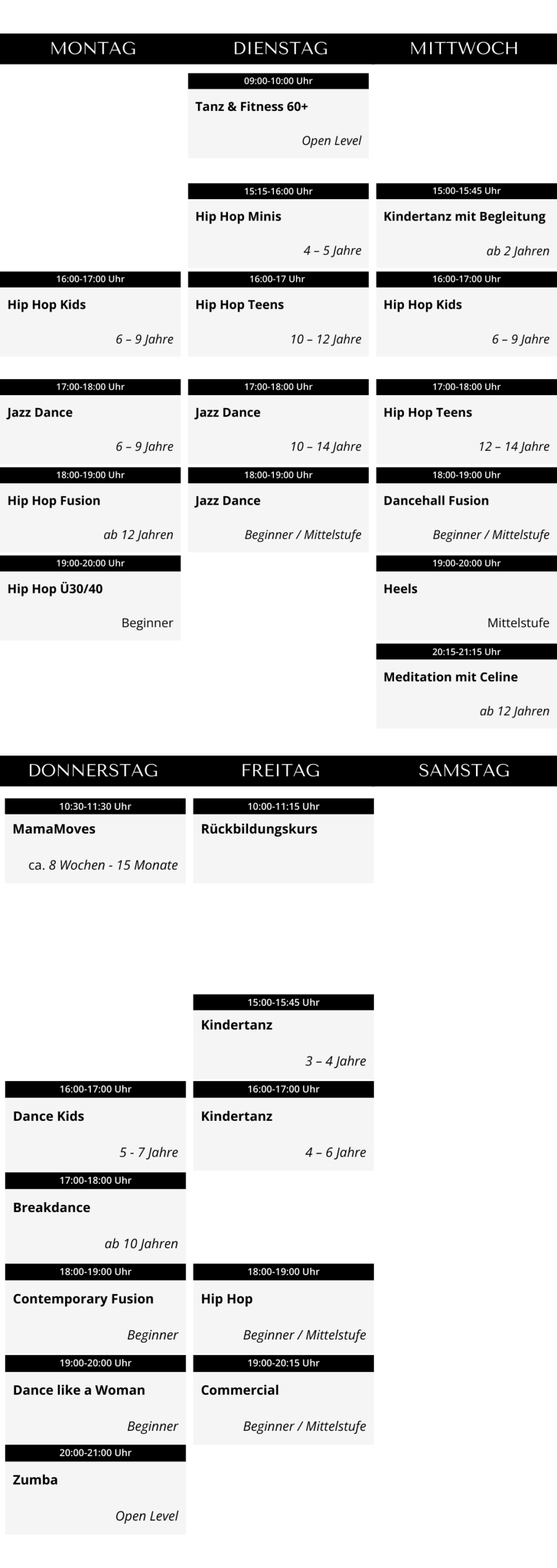 Aktuell befinden wir uns in den Vorbereitungen für unsere Dance Show. Daher ist ein Einstieg in laufende Classes im Moment nur eingeschränkt möglich. Wenn du Interesse am Ausprobieren hast, schreib uns bitte vorab kurz an.